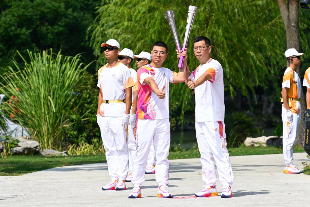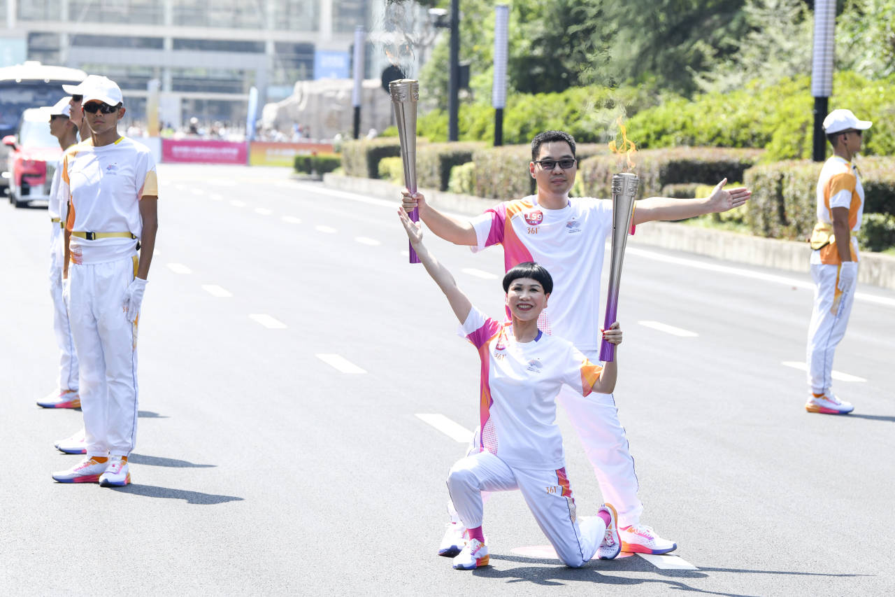 火炬手陈理铭与沈红梅火炬传递中,身后是被誉为“森林中的火车站”——嘉兴站。