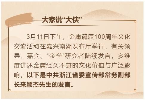 置身浙江新时代文化建设的新征程,我们纪念金庸先生,更被赋予了新的内涵、新的要求、新的目标。如何以此为激励,进一步激活文化基因、激发创作活力、激励创造热情,让文化成为中国式现代化浙江新篇章中最富魅力、最吸引人、最具辨识度的闪亮标识,是值得深入思考的课题。