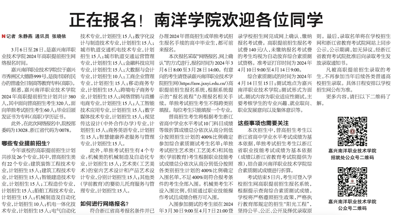 3月6日至28日,是嘉兴南洋职业技术学院2024年高职提前招生网络报名时间。