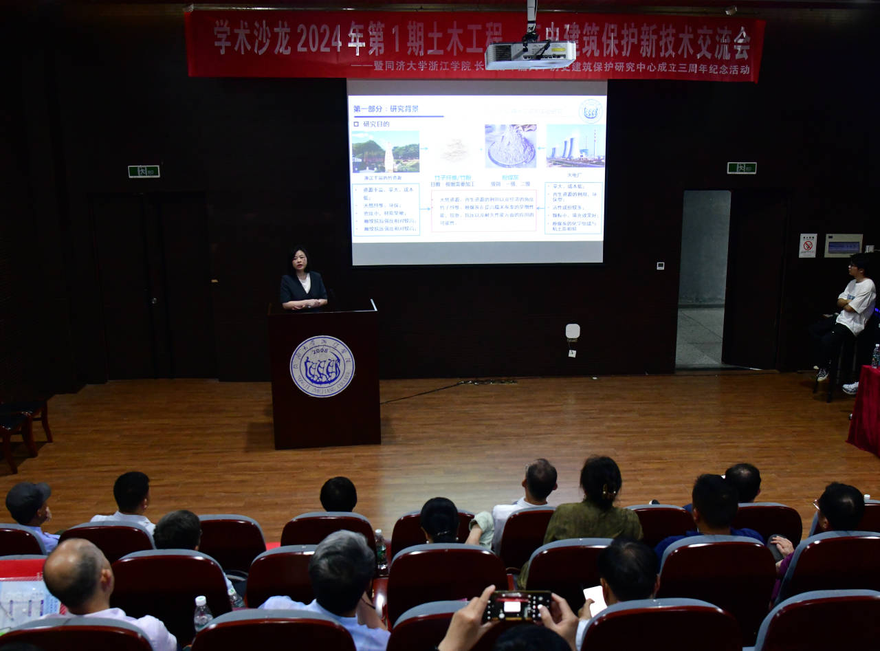 学术沙龙上,来自政府部门、高校、施工企业和设计单位的多位行业专家进行了主旨报告,内容涵盖新型建筑材料、施工技术、历史建筑活化利用等多个方面。同济大学浙江学院的花蕾教授分享了关于《竹纤维改性糯米灰浆的研究》,展示了在传统材料改良方面的创新探索;河海大学吴二军教授则介绍了《建筑物托换、移位技术在民族建筑保护和发展中的应用》;上海大学的宾慧中以浦东张江镇艾氏民宅为例,探讨了《基于地域文化传承的绞圈房子保护活化利用》策略。此外,上海建工四建集团有限公司的任瑛楠和同济大学浙江学院的朱嘉分别就《历史建筑全生命期数字孪生技术》与《京杭运河(王江泾段)粮仓结构加固改造技术研究》发表见解,为历史建筑的保护与利用提供了科技支撑。