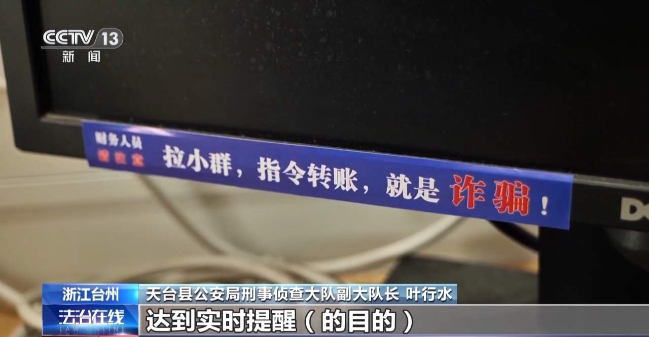 天台县公安局刑事侦查大队副大队长 叶行水:这个案件有一个特点,都是通过拉小群指定转账,然后再实施诈骗。所以我们做了一条反诈标语,拉小群,指令转账,就是诈骗!贴在每一个财务人员的电脑上,达到实时提醒的目的。
