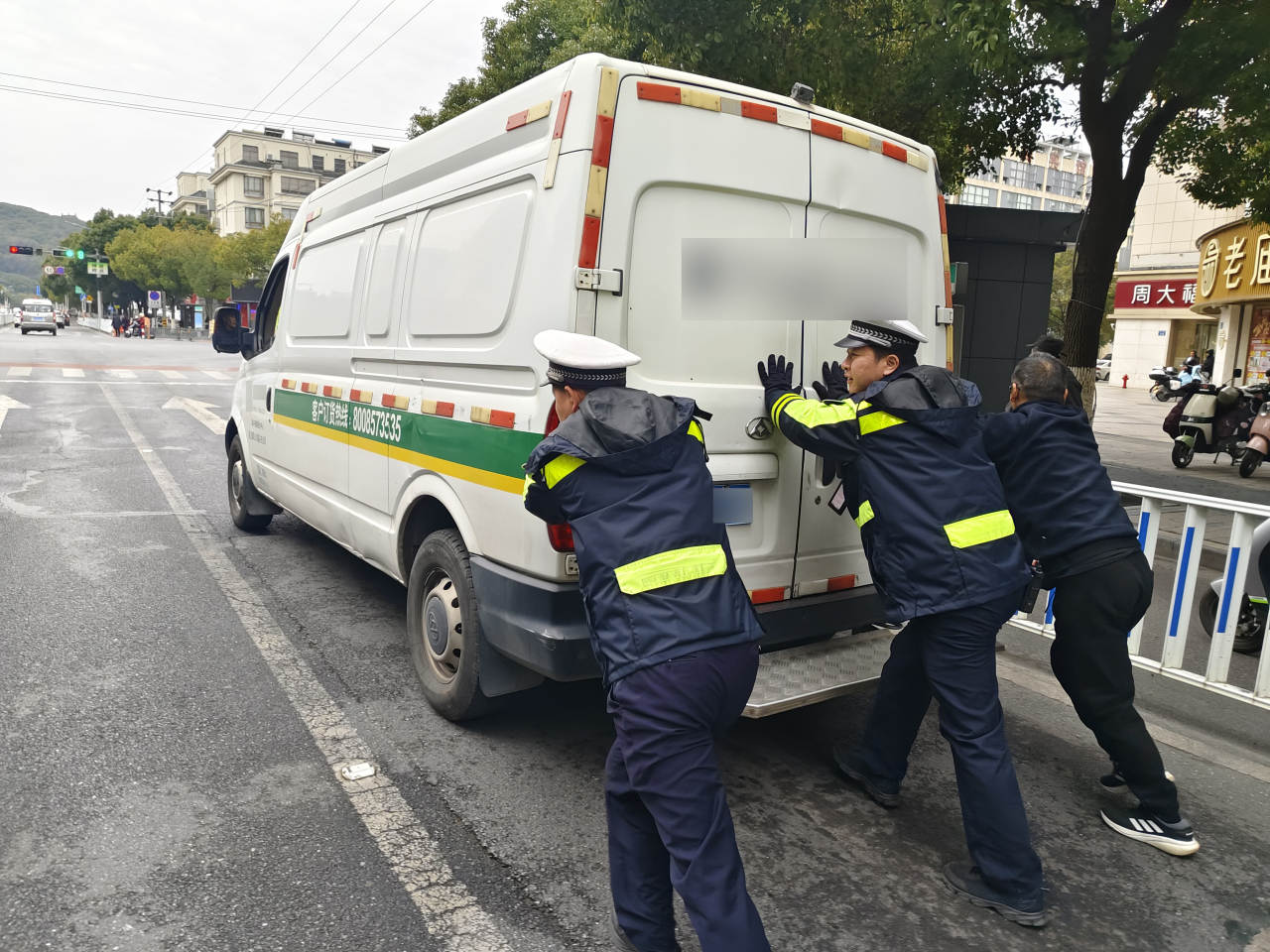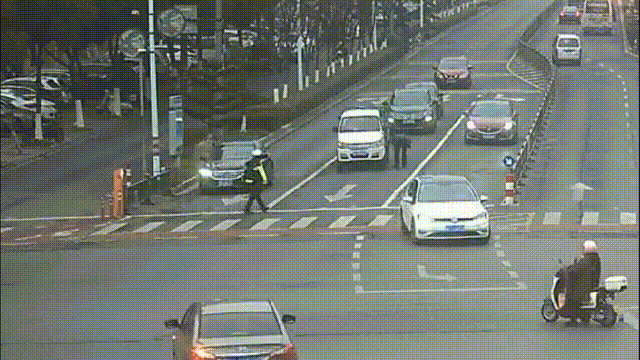 无独有偶,两周前,辅警沈根学、陈虹平等人正在天妃路雅山路口附近开展整治行动,此时,一辆货车停在路口打起了双闪,沈根学几人上前询问情况,得知车主从嘉兴过来送货,行至半路突然抛锚动不了了,自己已经联系了公司同事和维修人员。为了防止影响其他车辆通行,也避免二次事故,几人当机立断,将车子推到路边,再等待救援人员到达。