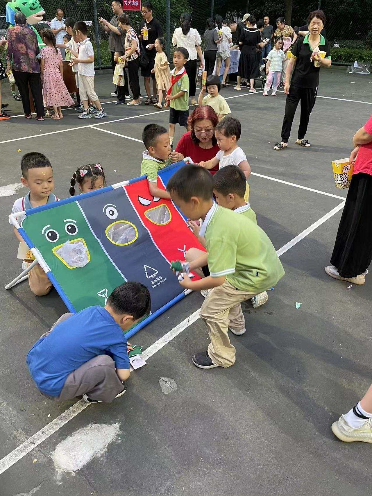 经过套圈、猜谜、合影等环节,到了孩子们参与最活跃的垃圾分类投放游戏。小朋友们在家长的帮助下分辨每个“垃圾”应该投放进哪个颜色的框内,随即弯曲手臂,瞄准洞口,将沙包稳稳落在袋内。体力和脑力结合,双管齐下,充分调动孩子们的协调性,进一步树立家长与孩子的自觉分类意识。