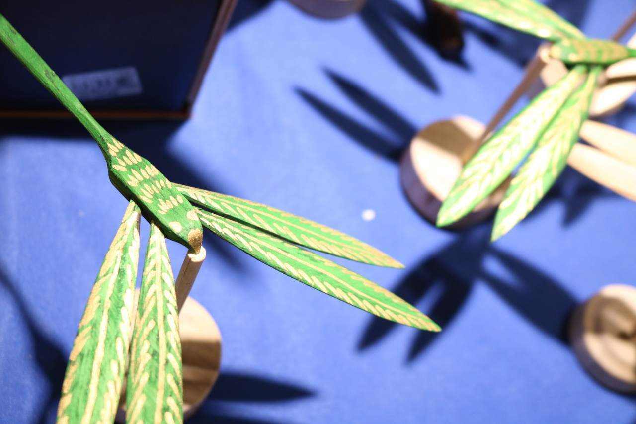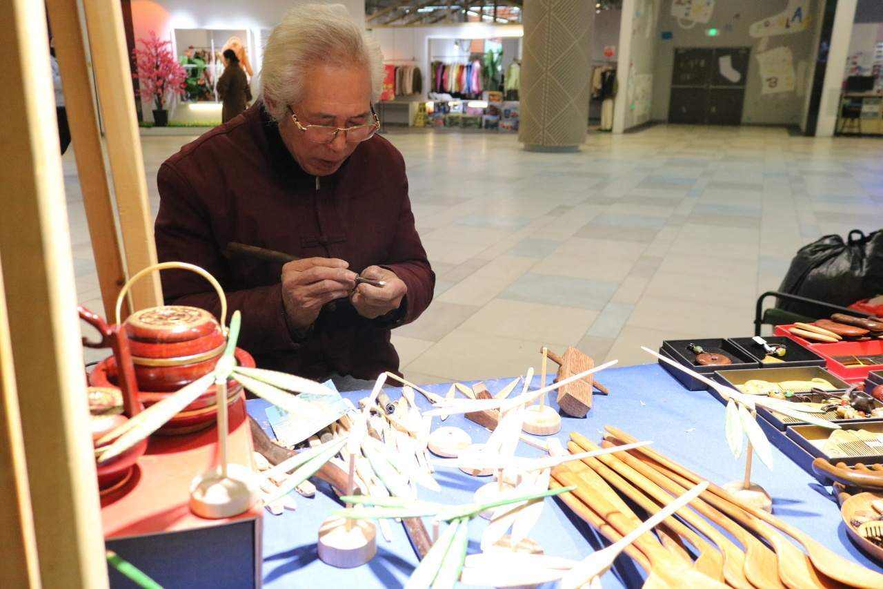 小小的木片,经过不断打磨和雕琢,一只栩栩如生的木制蜻蜓从平湖圆作传承人姚祖观的手中诞生。只见木蜻蜓没用上现代的精密器具,仅凭一双巧手,就能平稳地立在细棍上,振翅欲飞,恰似那句“小荷才露尖尖角,早有蜻蜓立上头。”将围在摊前的孩子们都看呆了。